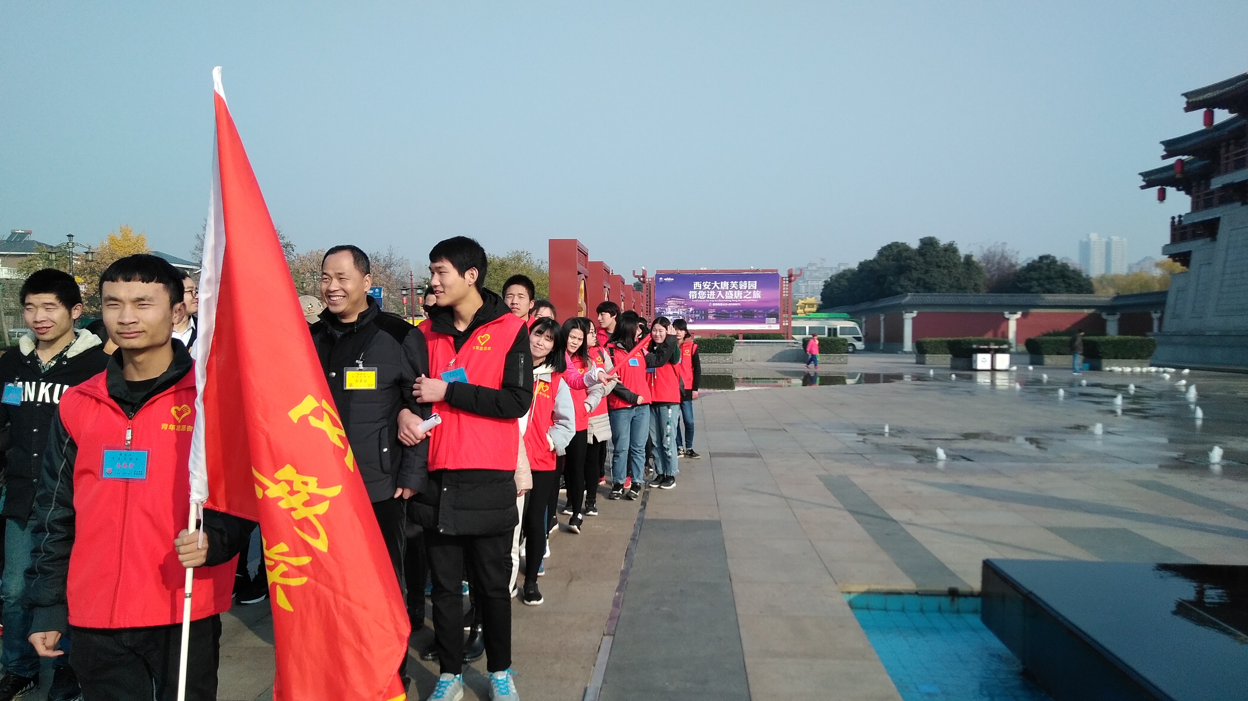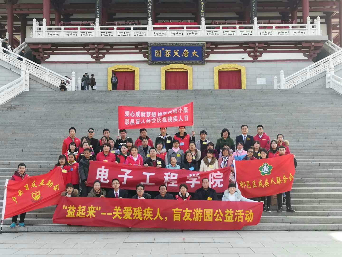 初冬的太阳暖烘烘的照在大地上。2017年12月3日在西安市大唐芙蓉园由电子工程学院与院团委联合组织志愿者帮扶活动。本次活动的主题是“爱心成就梦想,携手共创小康”。本次活动帮扶的对象是户县盲协和盲友互助会的盲人朋友。活动以关爱盲人生活,倾听盲人世界,通过活动让更多的人了解盲人生活不易,唤起人们的爱心。在与盲人的接触中过程中同学们学习盲人自强不息,乐观进取的精神,携手共创小康生活。